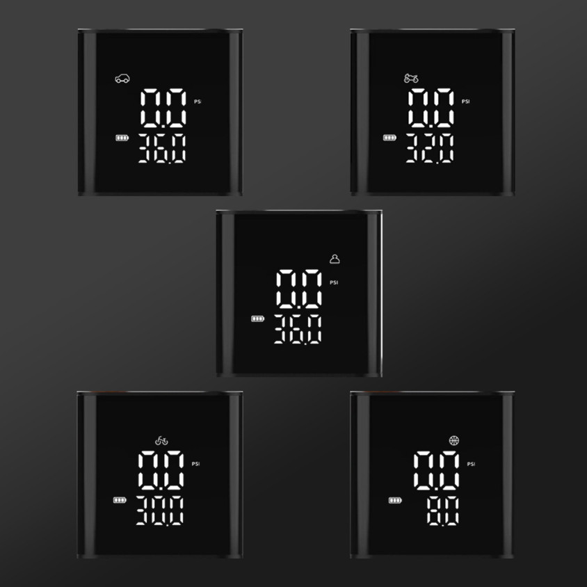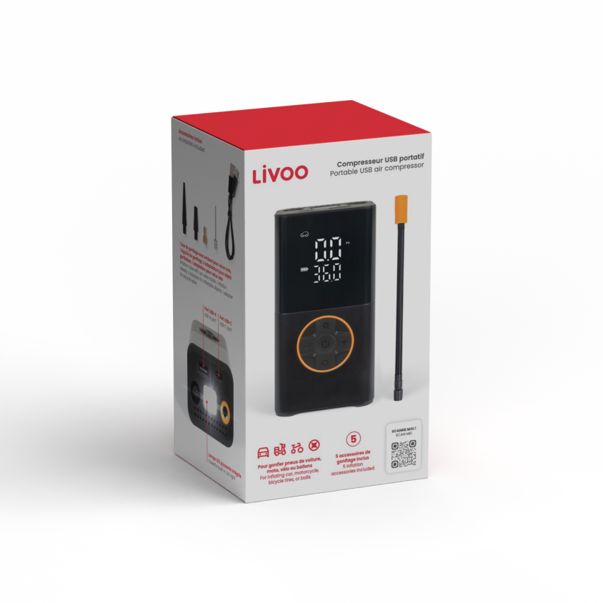 Permet de gonfler les pneus de voiture, moto, vélo et autres équipements gonflables. Réglage manuel de la pression. 5 modes de pression préréglés et 4 unités de mesures : PSI, BAR, KPA, kg/cm². Débit d’air 18 L/min, lampe LED puissante intégrée et batterie Li-ion : 2 x 2000 mAh. Sortie USB-A de 5W permettant de charger un smartphone jusqu’à 80%, écran LCD et temps de charge complète de 3-4 h. Charge par câble USB-Type C inclus et accessoires de gonflage inclus : tube de gonflage avec embout pour valve auto, 1 aiguille de gonflage, 2 adaptateurs pour objets gonflables, 1 adaptateur pour valve vélo.
