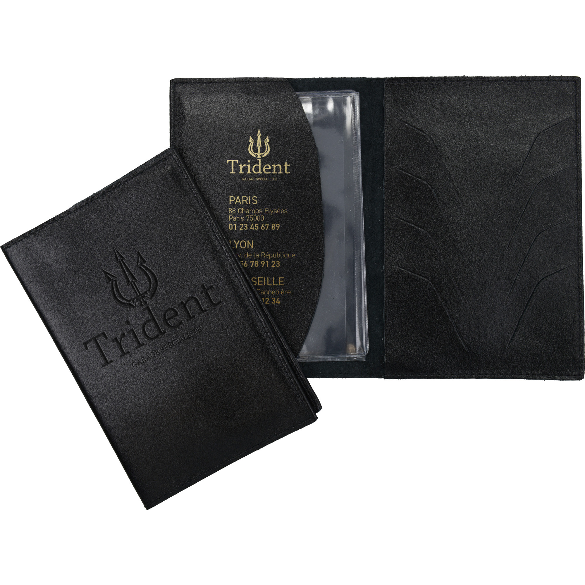 Etui carte grise en simili cuir avec dépliant cristal inclus et choix de la couleur du fil. Possibilité de marquage en creux sur demande. Fabriqué et imprimé en France.