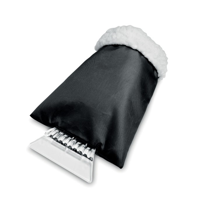 Grattoir à glace en plastique pour voiture avec gant de protection en mouton synthétique.