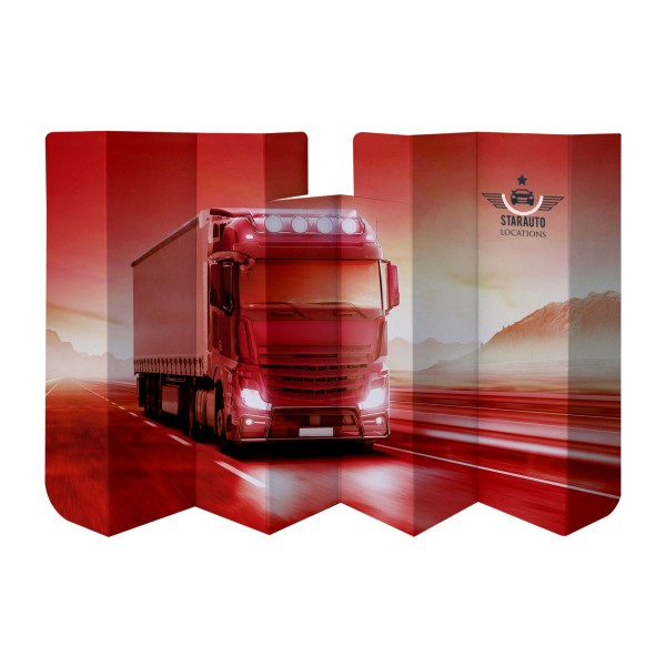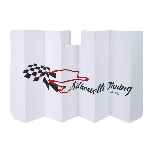 Pare-soleil avec 8 volets, 7 plis. Livré à plat. Carton épaisseur 1.5 mm. Un marquage 1 couleur 1 position inclus (hors frais techniques).