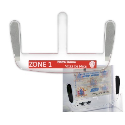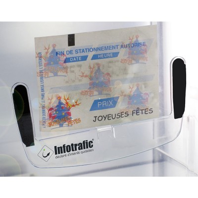 Support adhésif permettant de maintenir un ticket de parking, 1 carte ou autre sur le pare-brise d’une voiture. Par défaut, lecture du message publicitaire à l’extérieur.