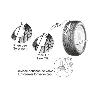 Testeur d’usure manuel et dévisse bouchon de valve de pneu. Livré en vrac en sac de 100 pièces.