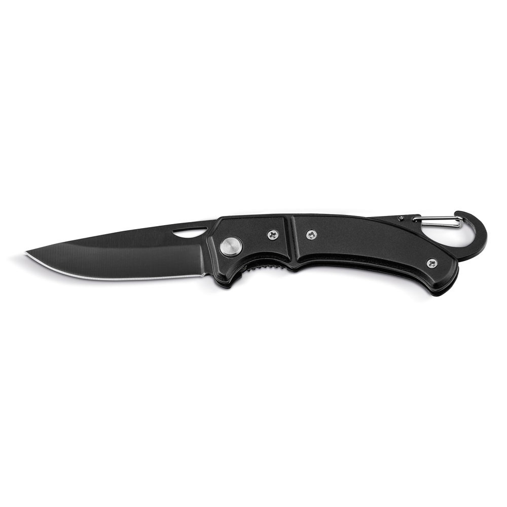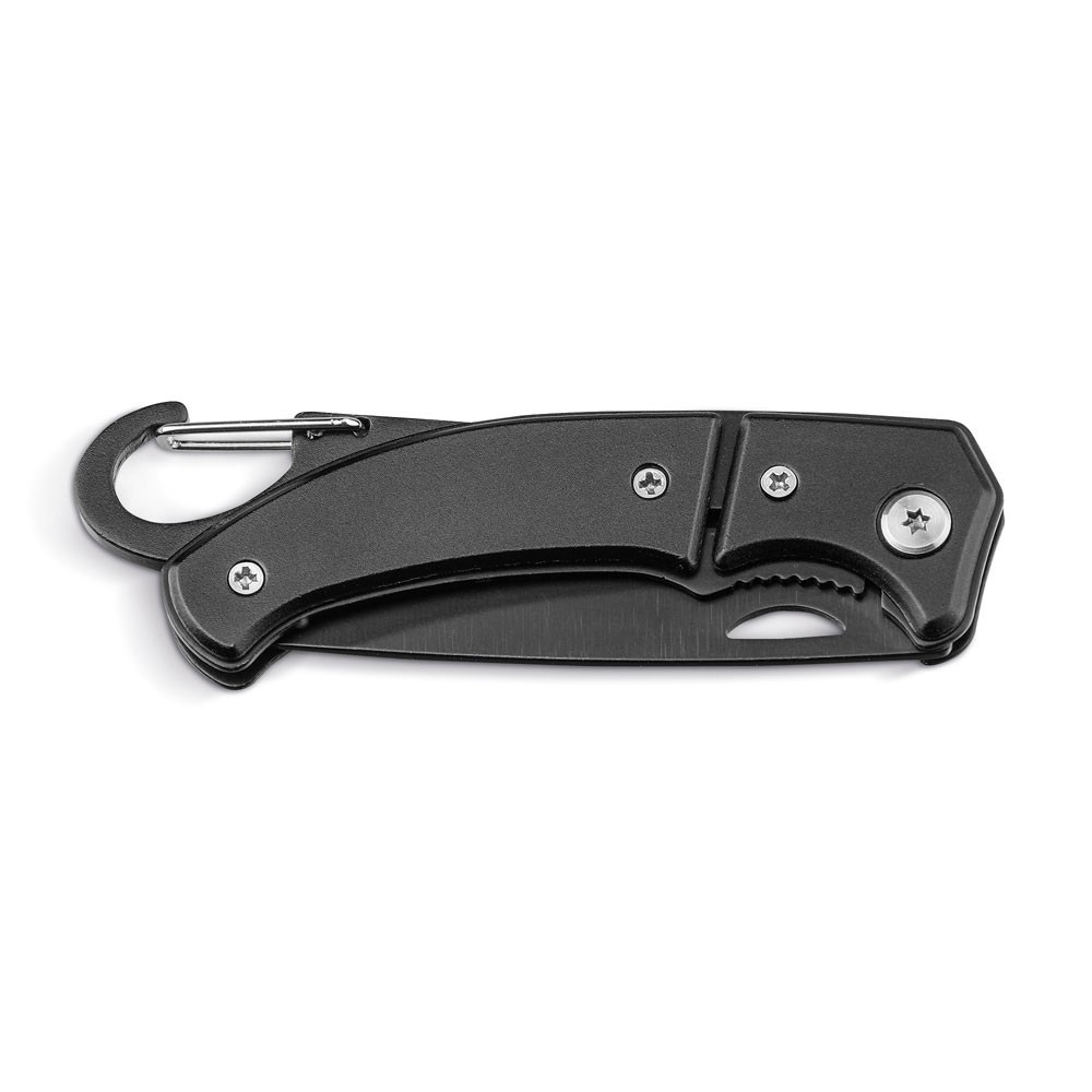 Canif en acier inoxydable et métal avec fermeture de sécurité et mosqueton. Fourni dans une boîte cadeau. Fabriqué en Chine.