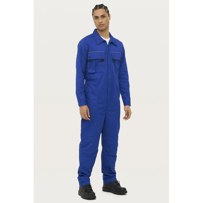 Combinaison workwear simple zip, 65% polyester – 35% coton Polycoton 240, 10 poches, poches à rabat avec passepoil réfléchissant. Emplacements extérieurs pour genouillères, taille dos élastiquée, soufflets d’aisance au dos, zip double curseur et étiquette identité intérieure tissée.