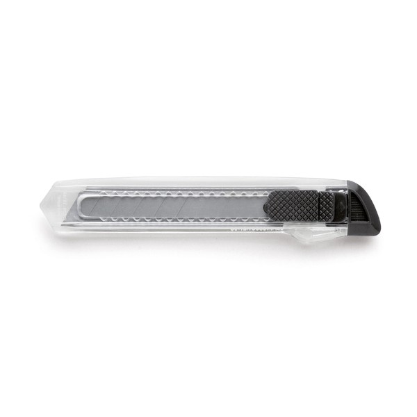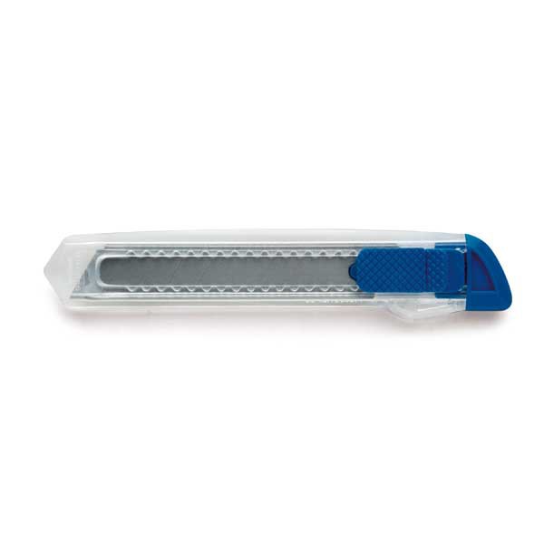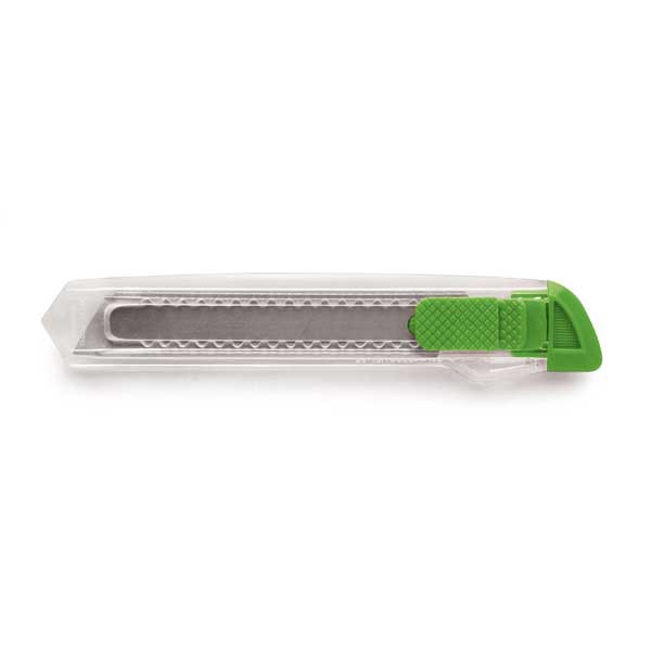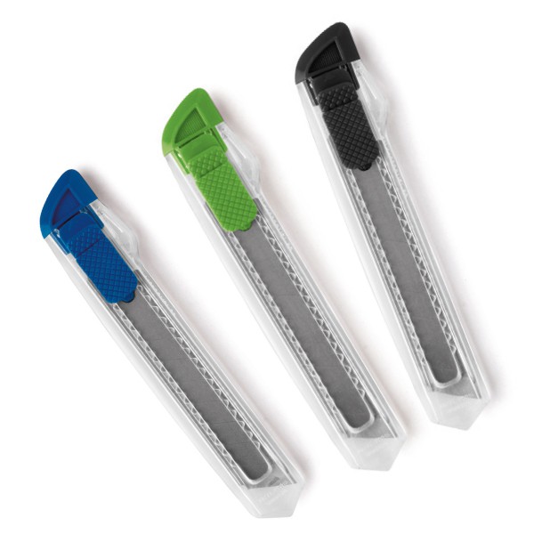 Cutter avec mécanisme de verrouillage pour la sécurité et dessus amovible pour le réglage de la lame. Cutter avec corps transparent. Fabriqué en Chine.