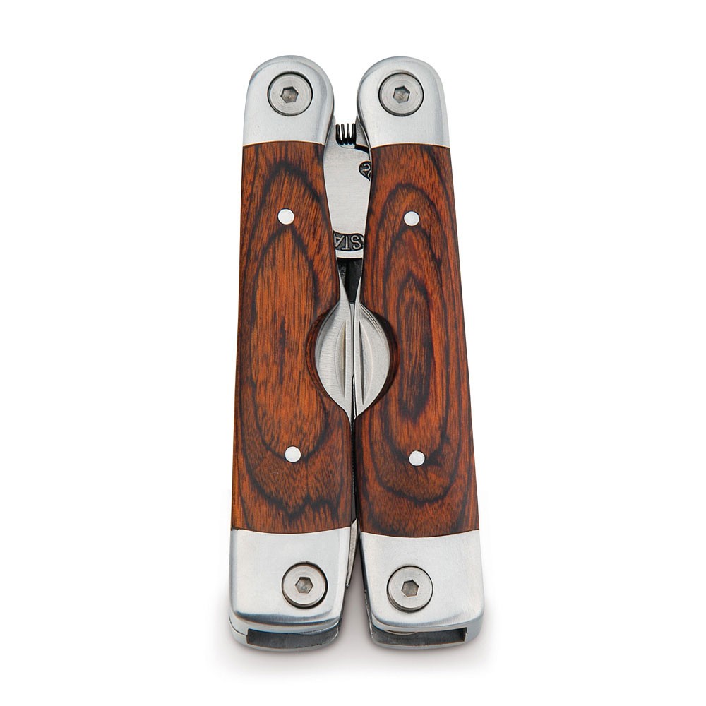 Pince pliante multifonctions en acier inoxydable et en bois. Comprend 20 fonctions : pinces, tournevis, embout et adaptateur d’embout 10x, alène en cuir, décapsuleur, règle, ecailleur, arrache-hameçon, tournevis en PH, tournevis à tête plate, couteau et vis. Livré dans un sac en polyester. Fabriqué en Chine.