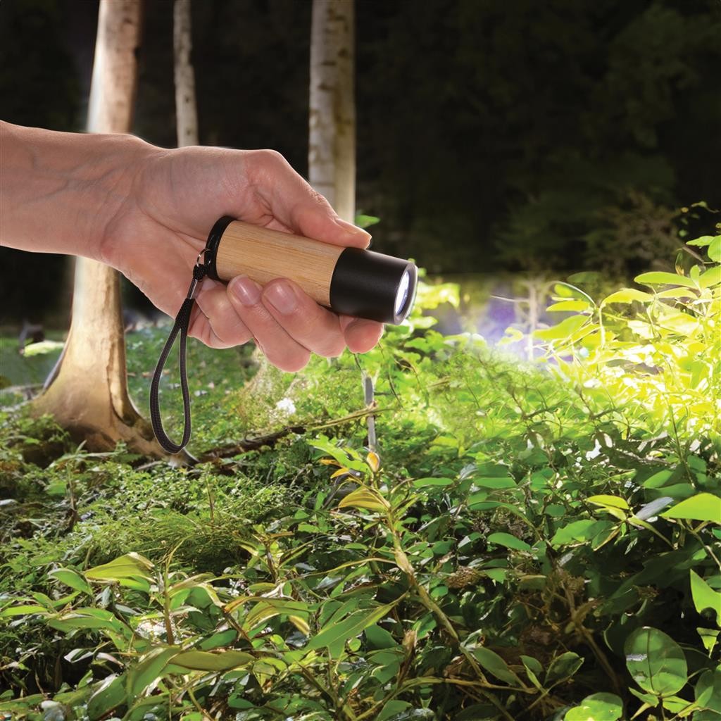 Lampe de poche de poche fabriquée en bambou FSC® 100% et en plastique recyclé certifié RCS (Recycled Claim Standard). Teneur totale en matières recyclées : 36% basée sur le poids total de l’article. La certification RCS garantit une chaîne d’approvisionnement entièrement certifiée en matières recyclées. La distance du faisceau est de 20 mètres et fournit 30 lumens. Conditionné dans un emballage en kraft FSC® mixte. Article et accessoires 100% sans PVC. Piles incluses.