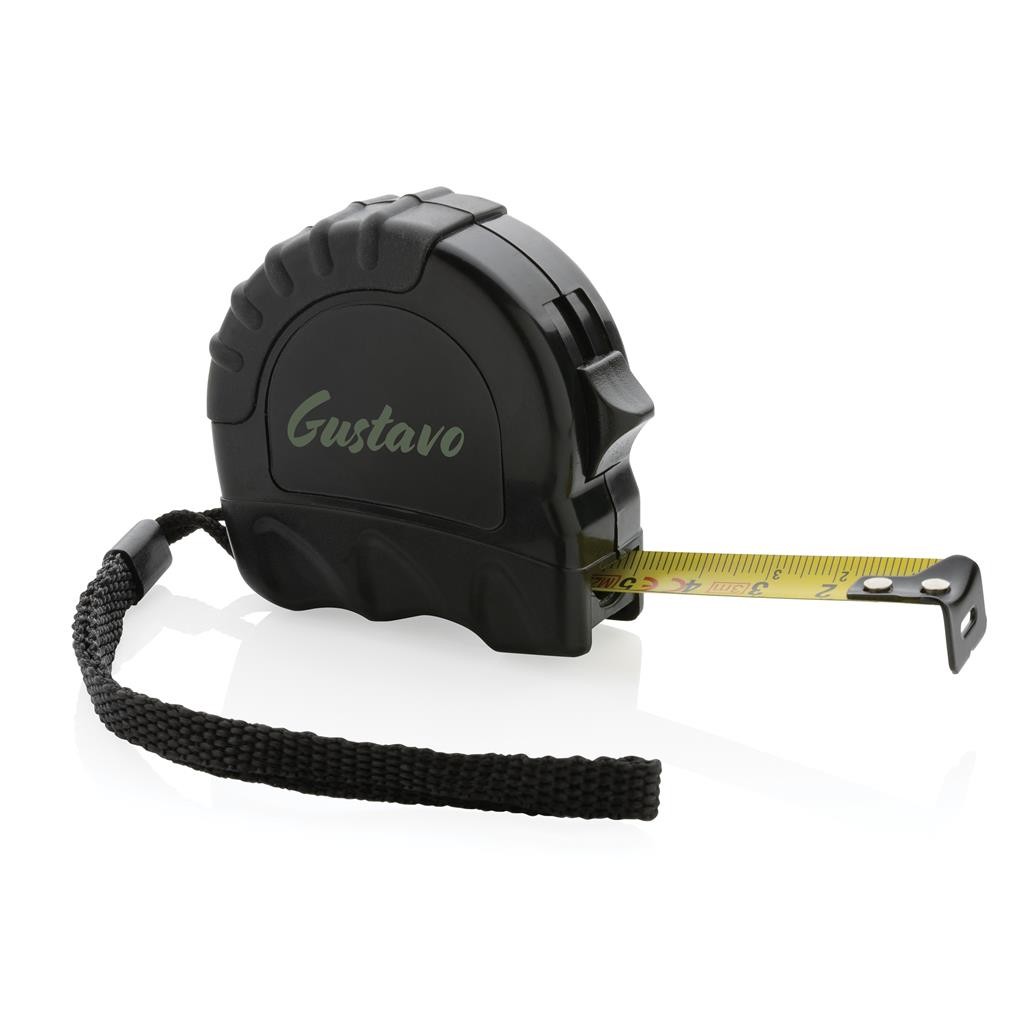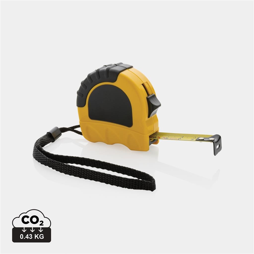 Mètre ruban 3m fabriqué en plastique ABS recyclé certifié RCS (Recycled Claim Standard). Contenu recyclé total: 21% basé sur le poids total de l’article. RCS est une norme permettant de vérifier le contenu recyclé d’un produit tout au long de la chaîne d’approvisionnement. Avec une poignée en TRP/caoutchouc pour une bonne prise en main, bouton de verrouillage, ruban jaune de 16 mm avec une impression sur 1 côté, crochet noir en acier, dragonne en polyester. Emballé dans une boîte kraft certifiée FSC®mix.