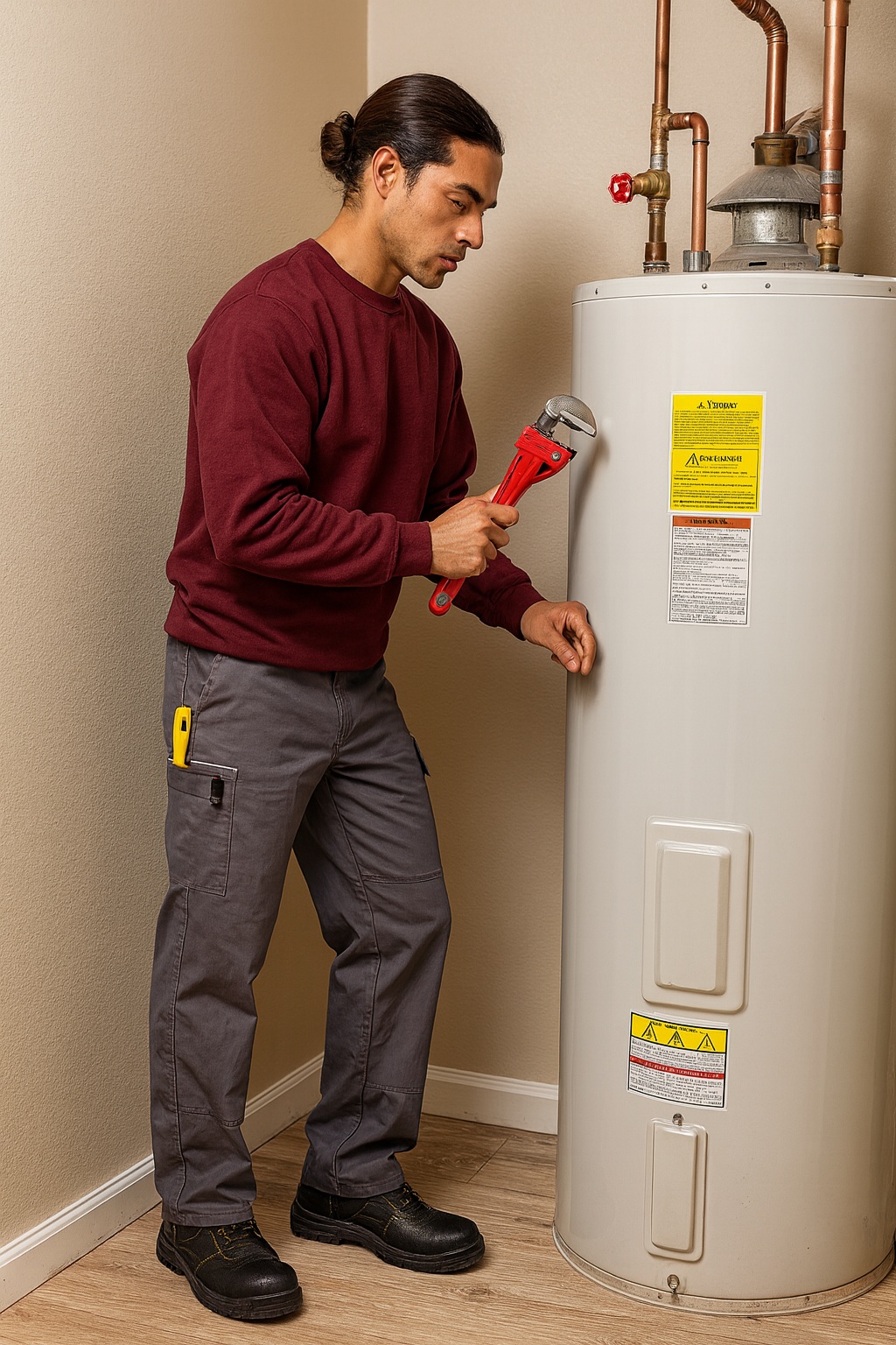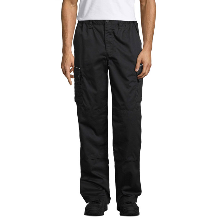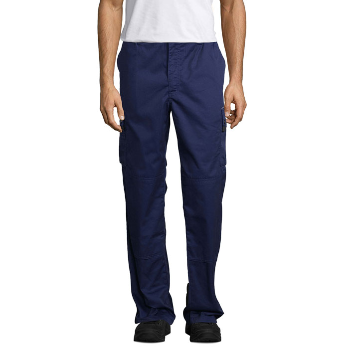 Pantalon workwear homme, 65% polyester – 35% coton Polycoton 240, 9 poches, rabat de poches avec passepoil réfléchissant, 2 emplacements stylo. Ouverture zip injecté noir, emplacement pour genouillères amovibles et étiquette identité intérieure tissée.