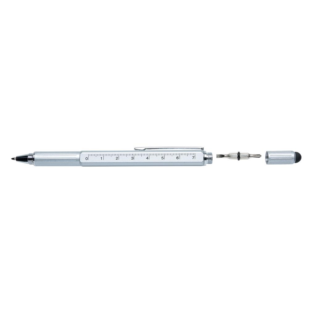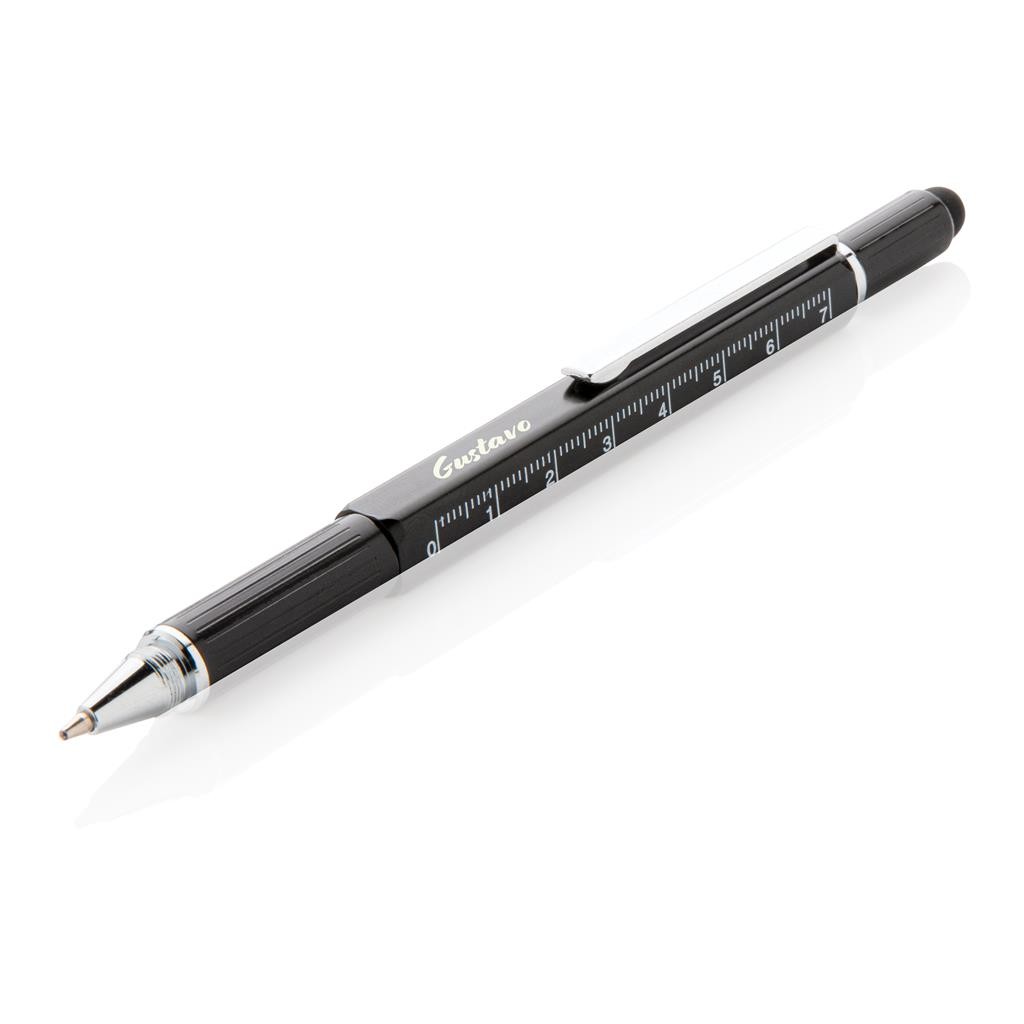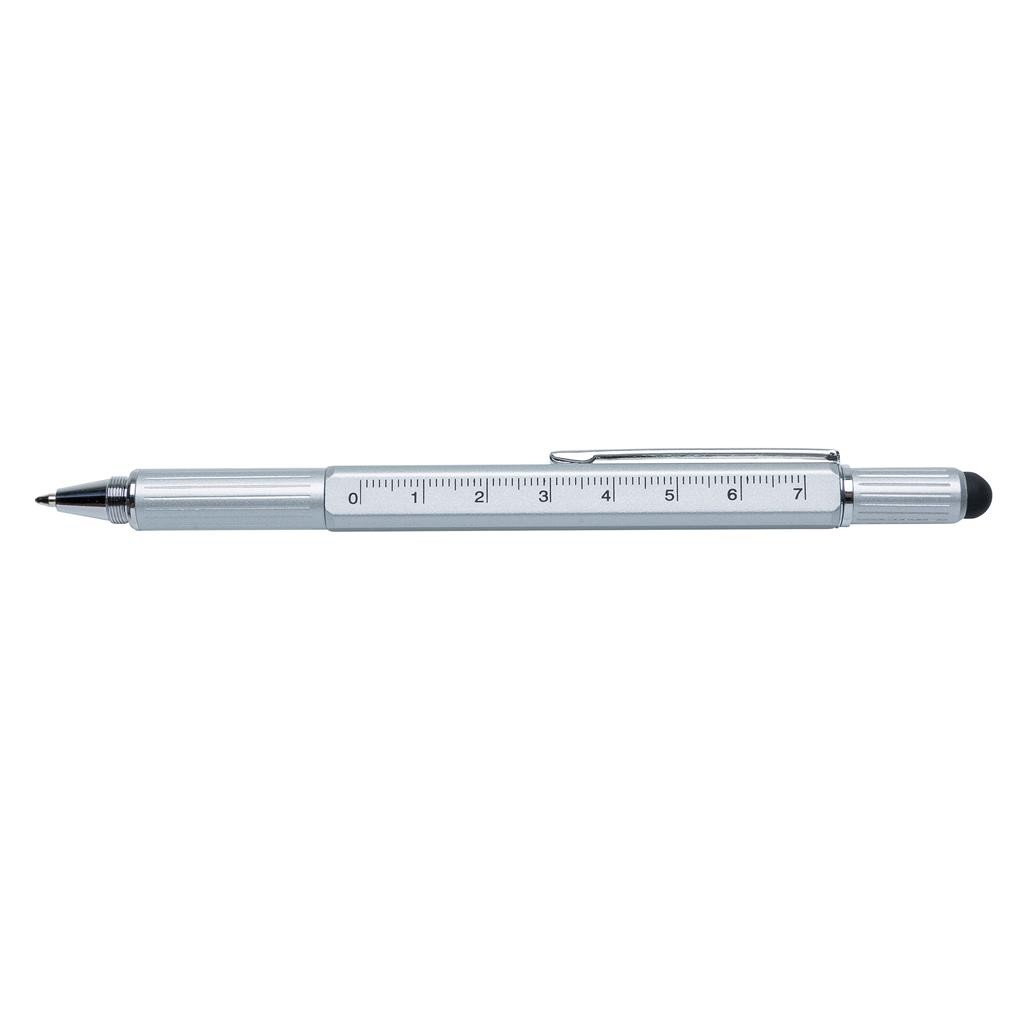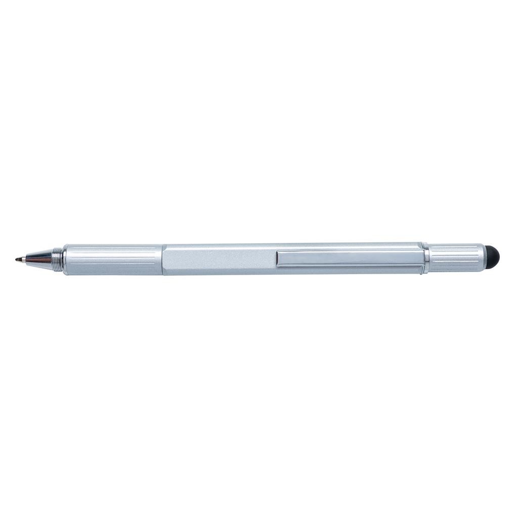 Stylo en laiton multifonctions avec règle (7 cm), niveau à bulle, tournevis, pointe stylet et stylo à bille à encre bleue (jusqu’à 400 m d’écriture)et avec clips en aluminium. Fabriqué en Chine.