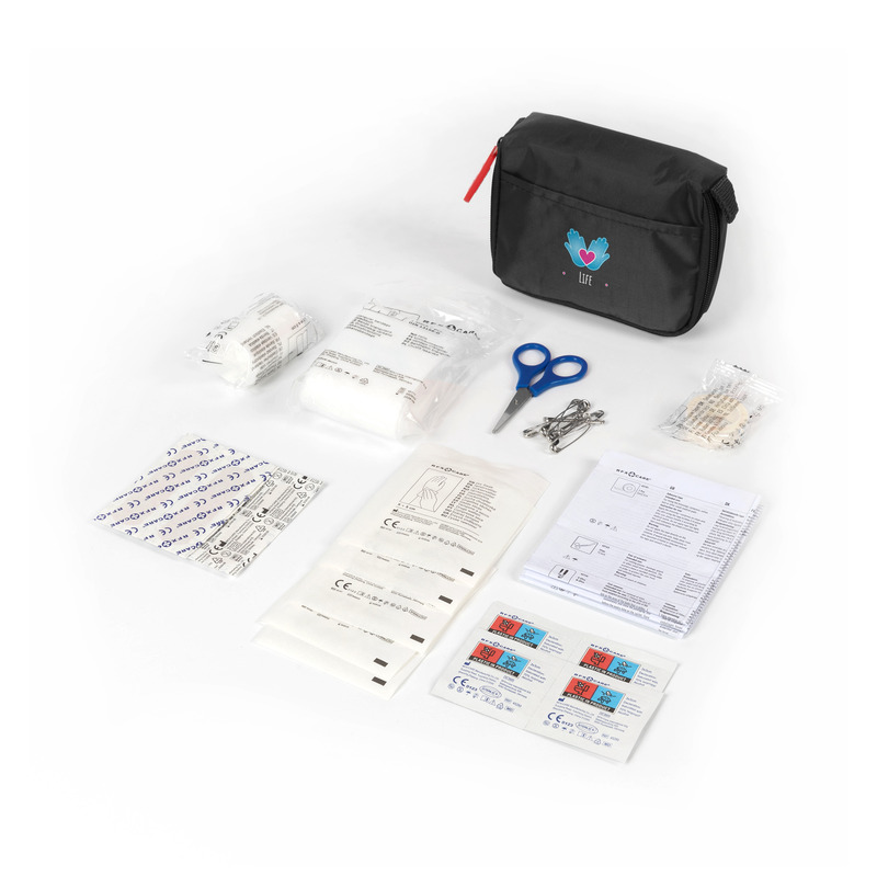 Kit de premiers secours MDR classe 2a. L’étui en nylon contient 31 pièces d’équipement de premiers secours d’une durée de conservation de 5 ans. Contenu : 9 pansements, 8 épingles à nourrice, 5 écouvillons secs, 4 tampons nettoyants pour la peau, 1 bandage triangulaire, 1 paire de mini-ciseaux, 1 bandage élastique, 1 rouleau de sparadrap et 1 mode d’emploi. Nylon. Fabriqué en Chine.