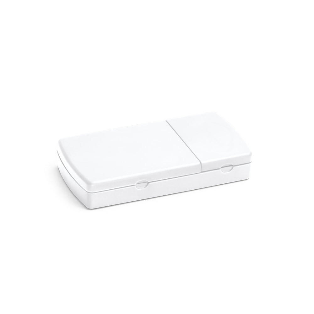 Pilulier avec couvercle, 2 séparateurs et cutter. Les séparateurs sont amovibles et colorés, facilitant leur distinction. Fabriqué en Chine.