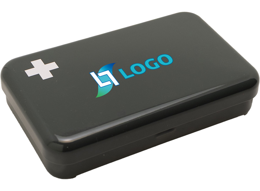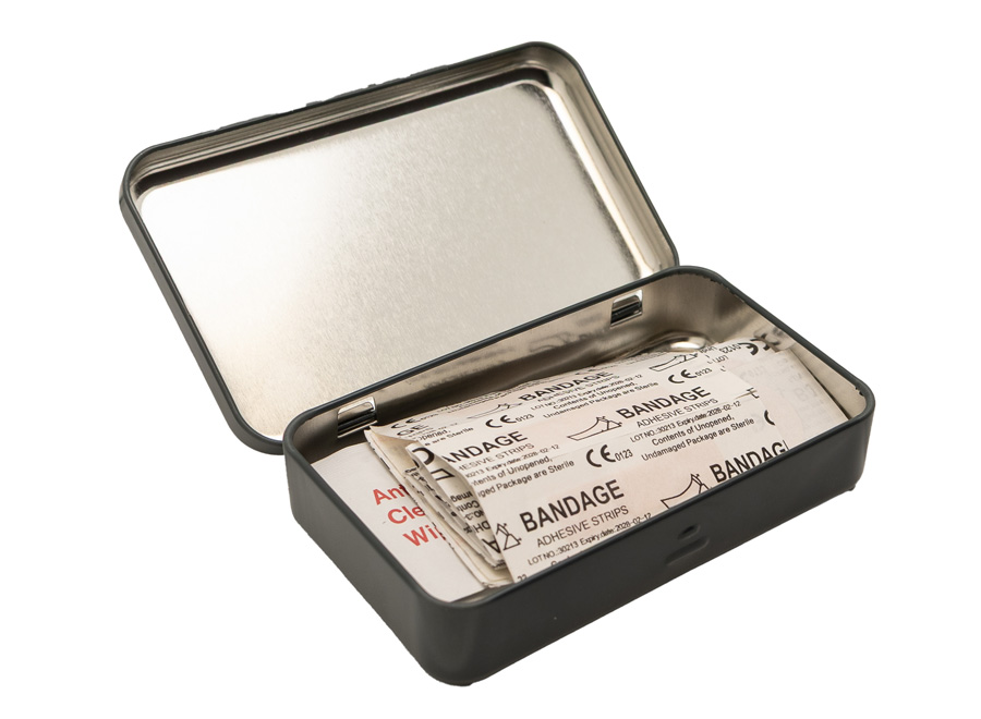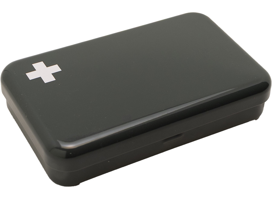 Boîte en aluminium gris anthracite composée des éléments suivants : 2 compresses nettoyantes, 4 compresses antiseptiques 3 x 3cm, 1 pansement ‘papillon’, 1 pansement ‘en H’, 5 pansements 7,6 x 2,5cm, 5 pansements 7,2 x 1,9cm, 5 pansements 4 x 1cm. Format ultra-compact contenant l’essentiel pour des premiers soins d’urgence. Elégante boîte pouvant aussi servir de boîte de rangement. Fabriqué en Chine.