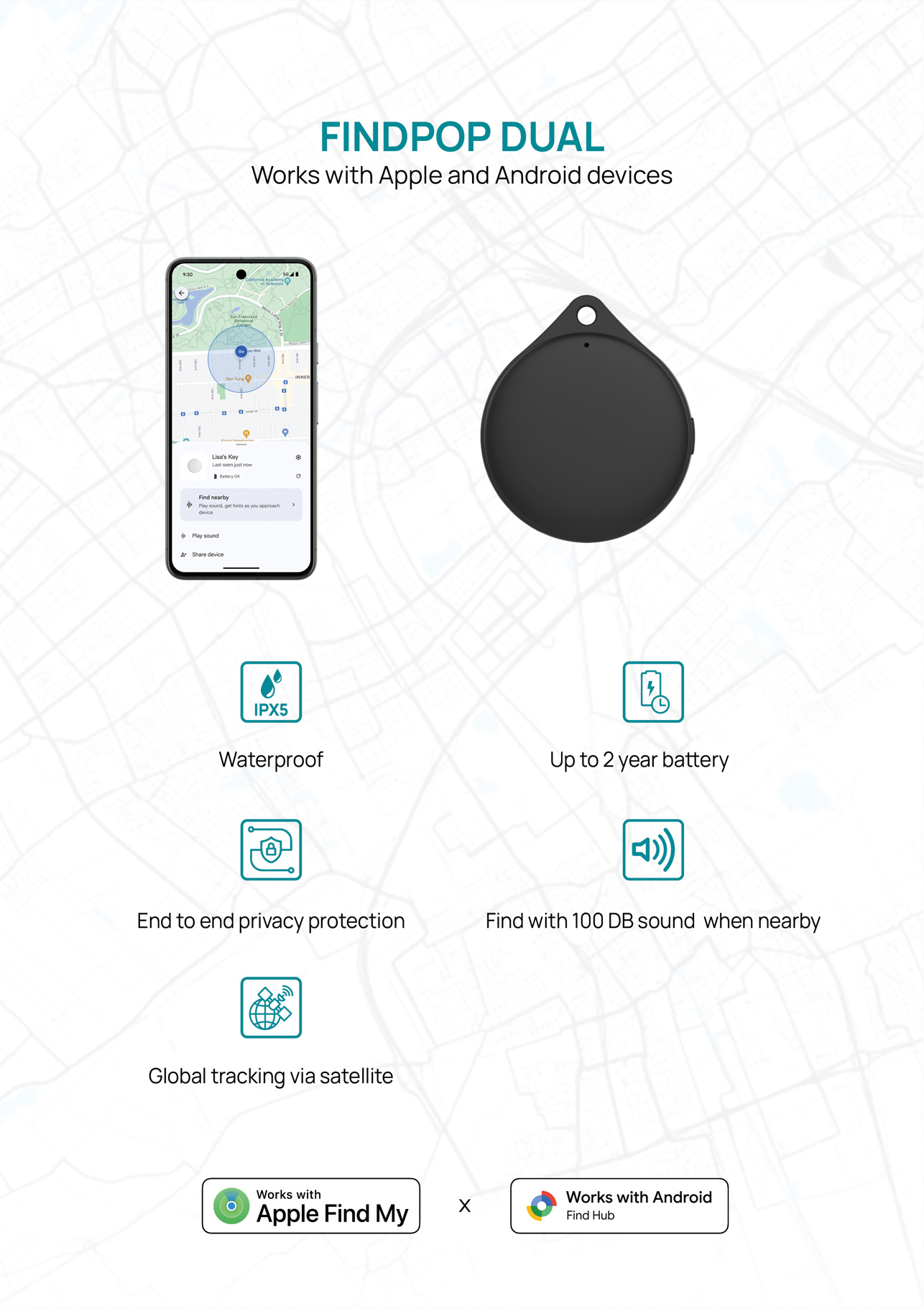 Ne perdez plus jamais vos objets grâce à Findpop, un dispositif de localisation haut de gamme qui fonctionne parfaitement avec les applications Find My d’Apple et Find Hub d’Android, ce qui le rend adapté à un large éventail d’utilisateurs. Avec Findpop, vous recevrez une notification instantanée si vous oubliez vos affaires, et même si elles sont complètement perdues, vous pourrez facilement les localiser partout dans le monde grâce aux réseaux pris en charge. Une fois à proximité, vous pouvez activer le son extra-fort de 100dB pour localiser leur position exacte. Son indice d’étanchéité IPX5 le protège contre les éclaboussures et la pluie, et la pile Panasonic CR2032 remplaçable de haute qualité offre jusqu’à 2 ans d’utilisation. Fabriqué à partir de plastique ABS recyclé certifié RCS et emballé dans un emballage FSC. Fabriqué en Chine.