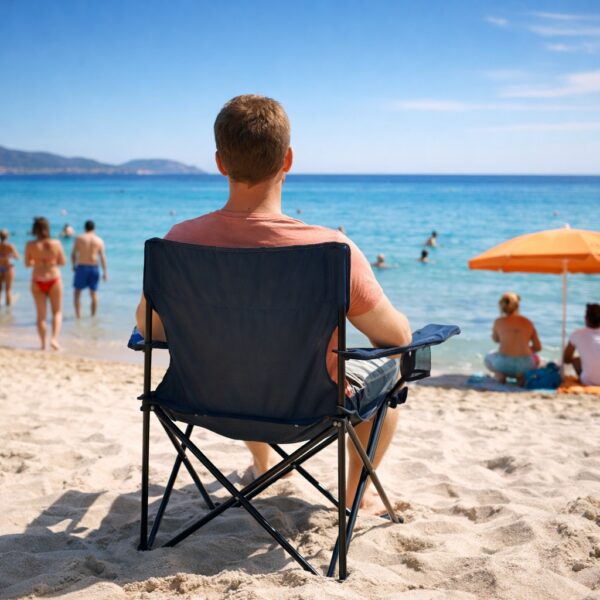 Chaise de plage en polyester 600D et cadre en acier. Pochette de rangement en nylon incluse. Poids max.100 kg. Fabriqué en Chine.