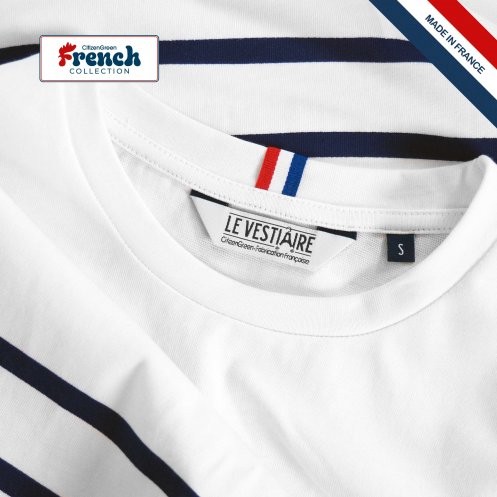 Marinière manches courtes 100% coton biologique 230g/m² avec puce bleu blanc rouge.