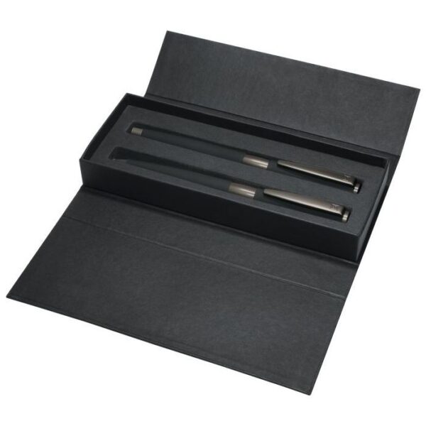 Set avec stylo à bille 2636SR + stylo plume 0104SR. Livré sous boite cadeau noire avec fermeture aimantée. Une gravure laser 1 position sur les 2 stylos et frais techniques inclus.