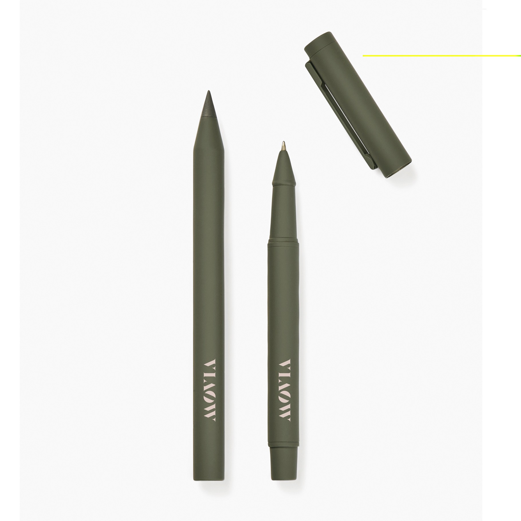 Cette parure moderne et élégante comprend deux stylos : un stylo éternel et un stylo à bille classique avec capuchon et clip. Conçus pour allier style et fonctionnalité, ces stylos sont fabriqués en acier inoxydable recyclé certifié RCS, avec un revêtement de surface en caoutchouc pour une prise en main confortable et une finition mate. Les deux stylos ont un poids équilibré qui garantit la stabilité et une écriture sans effort. Le stylo éternel permet d’écrire sans limite. Le stylo à bille est doté d’une pointe fine de 1,00 mm et permet une écriture fluide et régulière avec l’encre bleue documentaire, qui dure jusqu’à 1200 mètres. Certifié par RCS (Recycled Claim Standard), la certification RCS garantit que l’ensemble de la chaîne d’approvisionnement en matériaux recyclés est certifiée. Le contenu recyclé total est basé sur le poids total du produit. Ce produit contient 52 % d’aluminium recyclé certifié RCS et 10 % d’acier inoxydable certifié RCS. Fabriqué en Chine avec empreinte EqCO² de 0.65kg.
