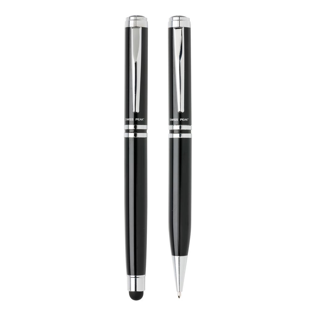 Set stylos exécutif Swiss Peak avec un roller et stylo à bille/stylet, corps en laiton et attributs en acier. Encre bleue Dokumental® de fabrication allemande pour +/- 1200m d’écriture et bille en carbure de tungstène assurant une écriture régulière. Livré avec pochette simili cuir et dans une boîte cadeau. Possibilité de personnalisation nominative sur demande. Fabriqué en Chine.