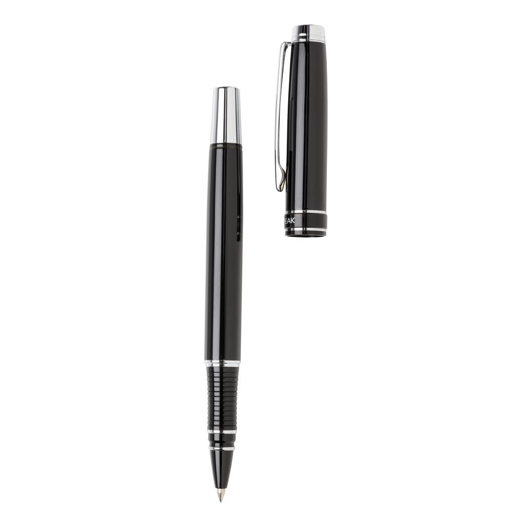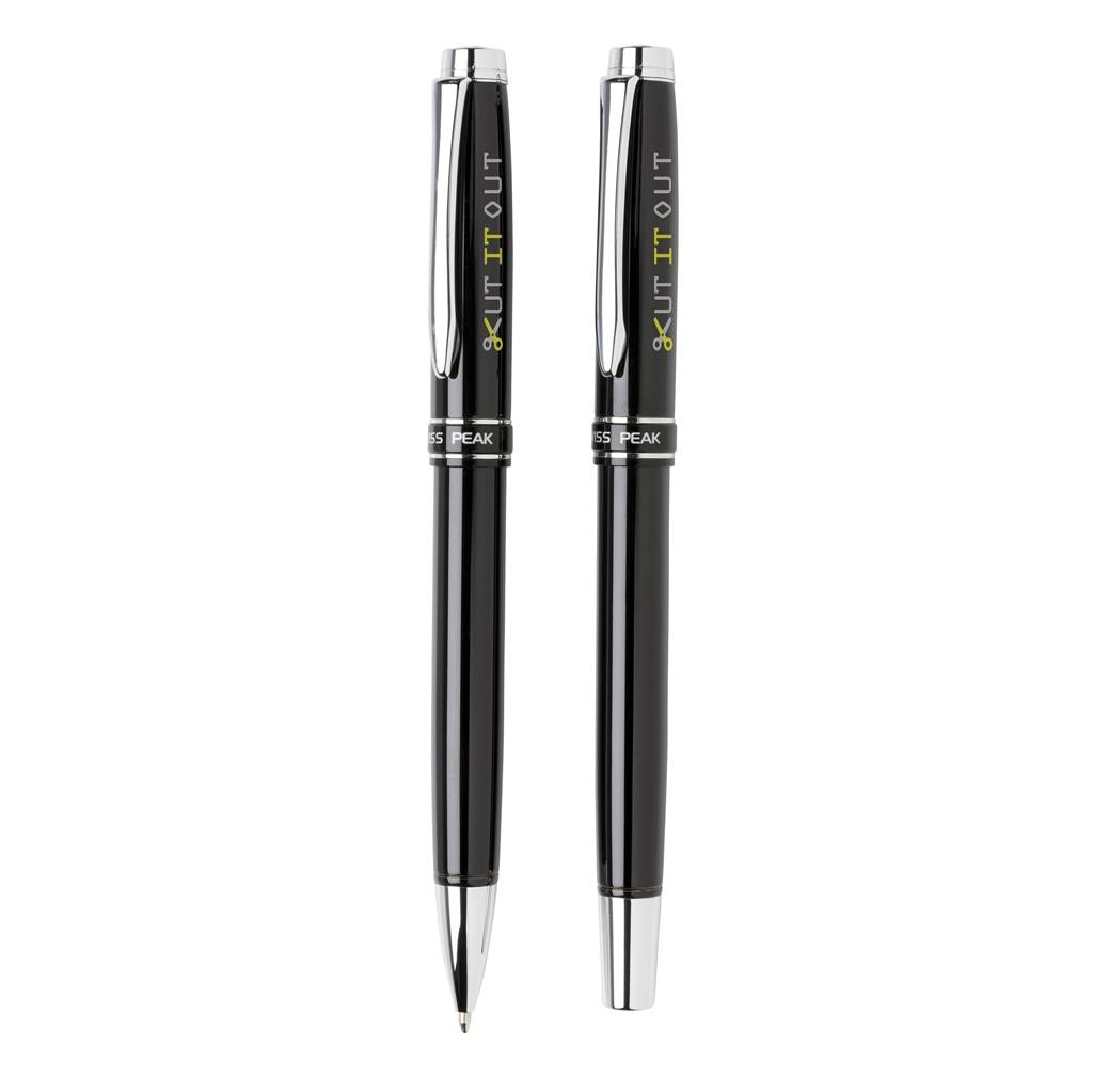 Set stylos Swiss Peak Héritage avec un roller et stylo à bille au design élégant. Encre bleue Dokumental® de fabrication allemande pour +/- 1200m d’écriture et bille en carbure de tungstène assurant une écriture régulière. Livré dans une boîte cadeau Swiss Peak.