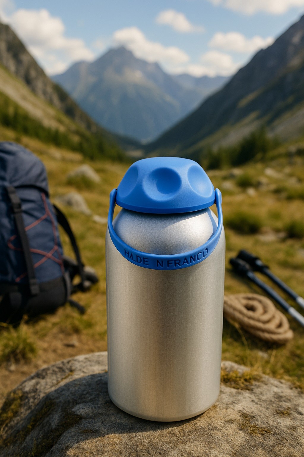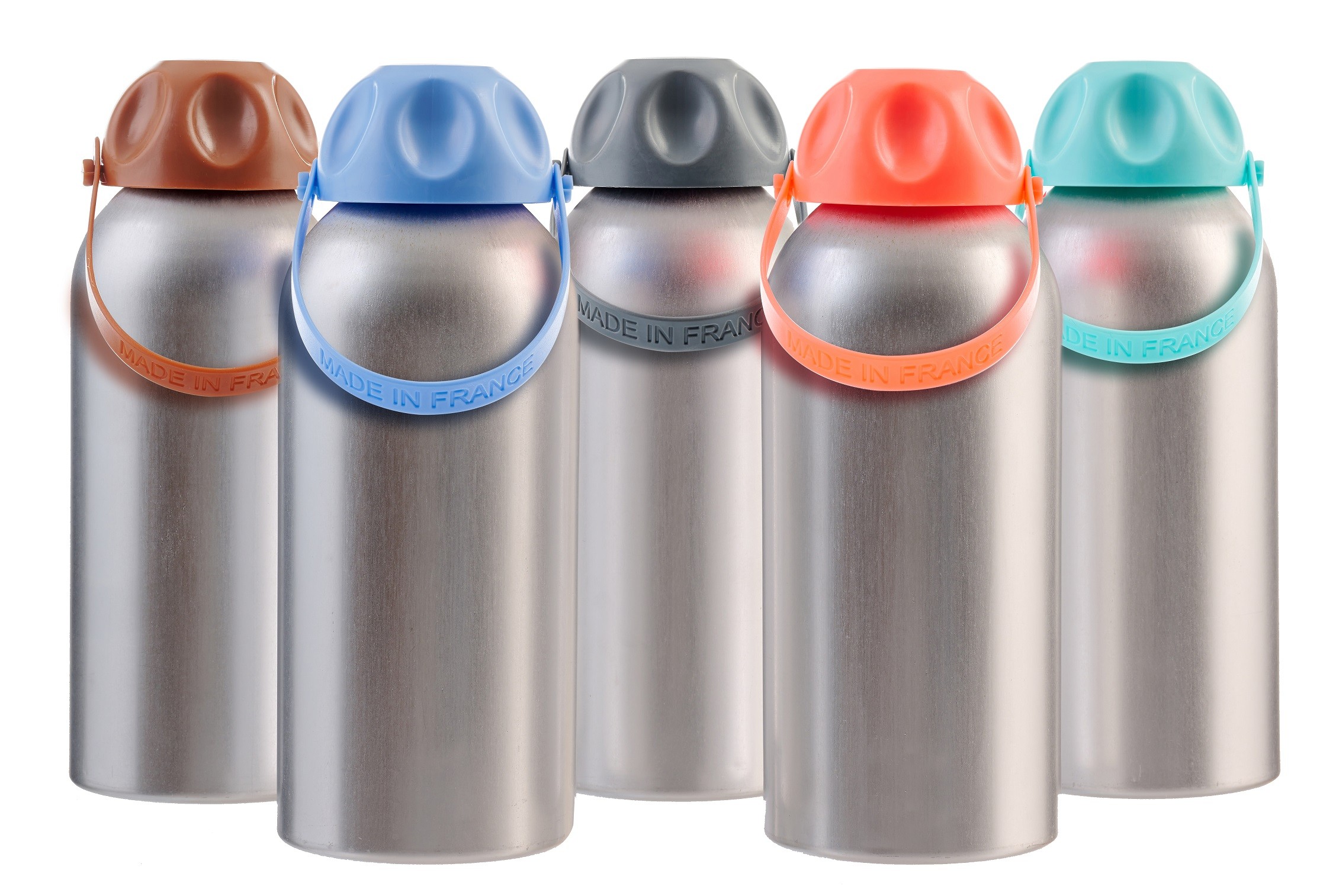 Bouteille 630 ml simple paroi en aluminium recyclé et bouchon en plastique recyclable. Conditionnement par colis de 60 pièces. Fabriqué en France (sauf le bouchon fabriqué en Espagne). Un marquage impression numérique quadri et frais techniques inclus.