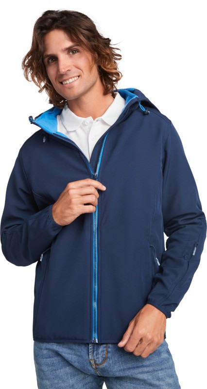 Softshell 2 couches en coupe sport. Fermeture zippée centrale contrastée avec protège-menton et tirette. Doublure intérieure en tissu micropolaire contrasté. Poche extérieure sur la poitrine droite avec fermeture zippée invisible en forme de diagonale. Deux poches latérales avec fermeture zippée invisible. Poche sur la manche gauche. Bordure élastique assortie aux poignets et à l’ourlet. Capuche pliable avec doublure micropolaire contrastée. Étiquette détachable. Imperméable. Coupe-vent. Le mannequin Homme mesure 185 cm et porte la taille M, le mannequin Femme mesure 174 cm et porte la taille S. Tissé 92% Polyester et 8% Elasthanne, 300 g/m², Lining, Micropolaire 100% Polyester.