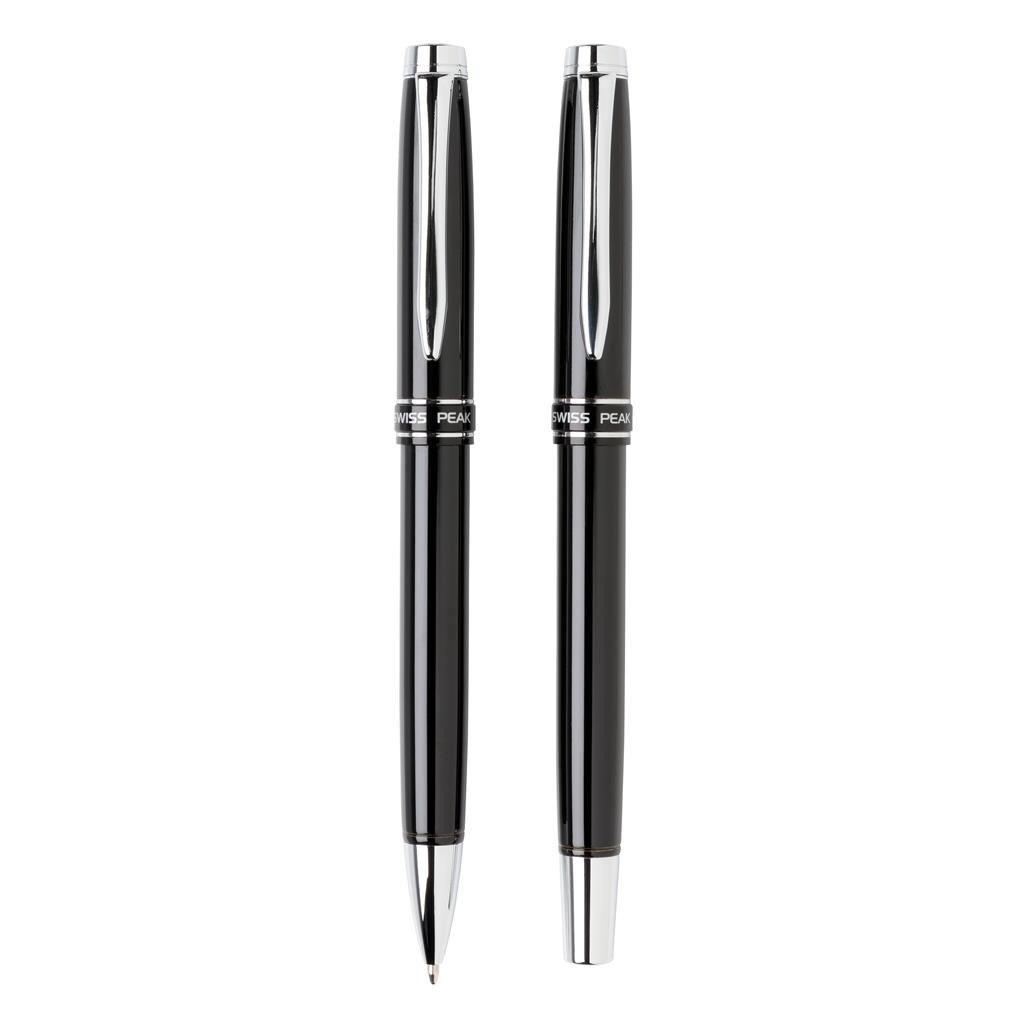 Set stylos Swiss Peak Héritage avec un roller et stylo à bille au design élégant. Encre bleue Dokumental® de fabrication allemande pour +/- 1200m d’écriture et bille en carbure de tungstène assurant une écriture régulière. Livré dans une boîte cadeau Swiss Peak.