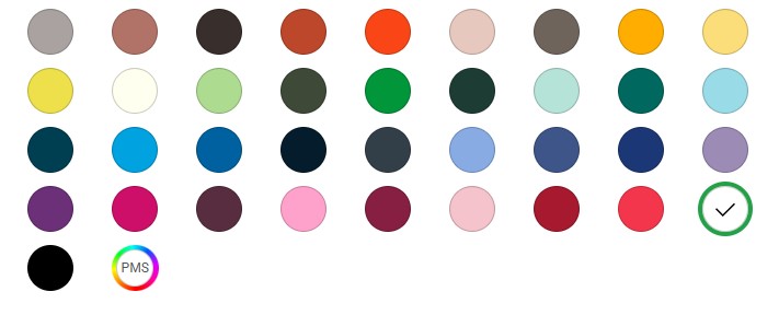 Coloris : Noir, blanc, 1787C, 187, 196U, 208C, 210U, 7644C, 214C, 7663C, 4121C, 3597C, 288U, 7451C, 432C, 296C, 2384C, 299C, 3035C, 304C, 329C, 573C, 560C, 355C, 4224C, 358C, ivoire, 603C, 2004C, 2010C, 7533U, 7611U, 172C, 7598C, 440C, 4038C, 4283C, PMS.